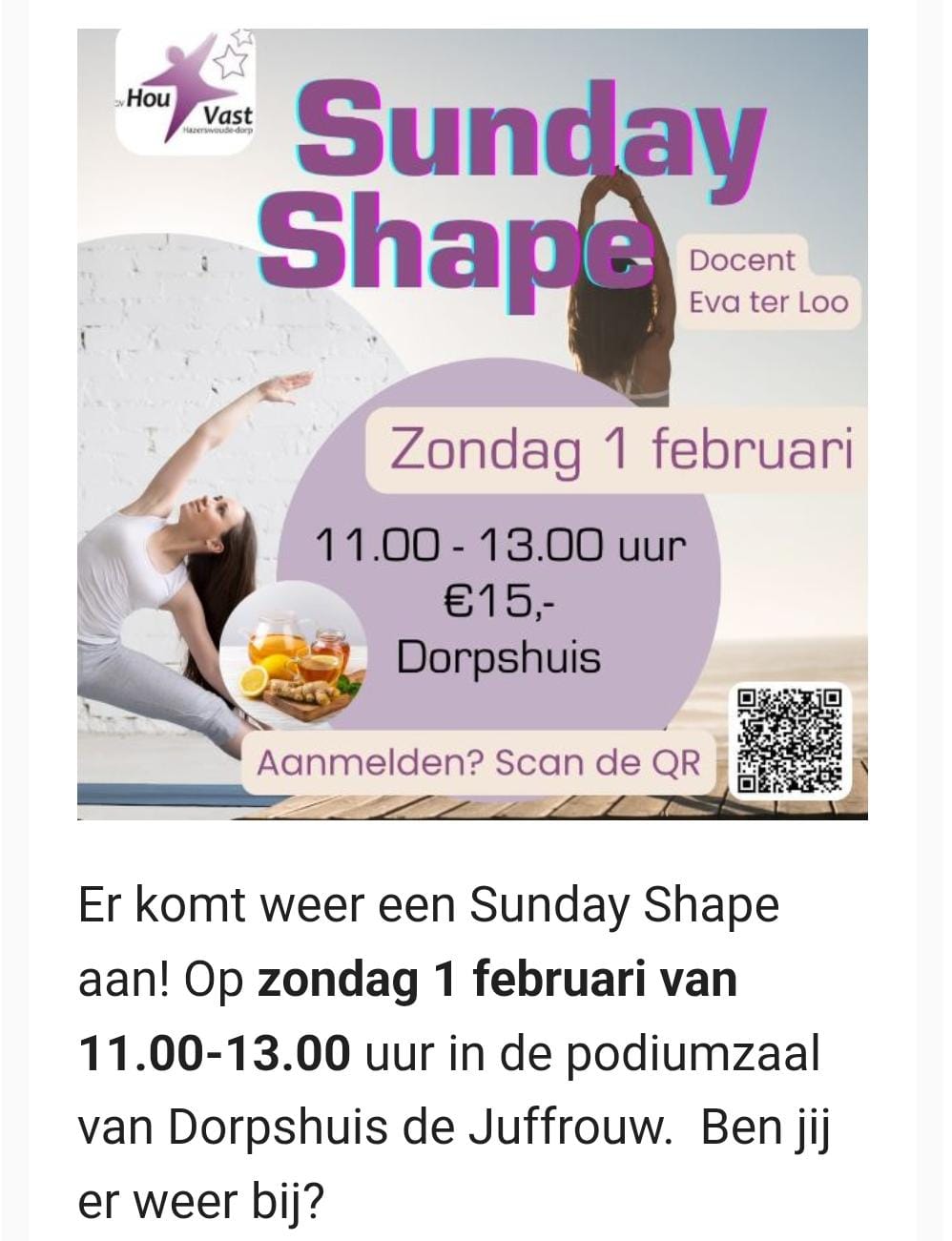 Op zondag 1 februari vanaf 11.00 uur organiseert Hou Vast in het Dorpshuis weer een Sunday Shape! Deze zondag begint goed met combinatielesjes van Yoga, Pilates, Dance Workout en Stretch en Stability. In deze speciale Sunday Shapeles train je je houding, stabiliteit, coördinatie, ademhaling en focus op lichaam en geest. Een effectieve training die alle spiergroepen versterkt en rekt, met als doel een soepel lichaam te krijgen. Docent van Sunday Shape is onze Eva ter Loo. Voor een vriendenprijs: 15,-